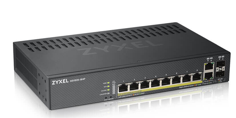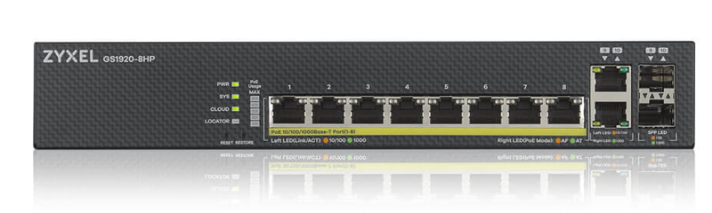 - Smart L2 PoE+ Zyxel NebulaFlex GS1920-8HPv2, 8xGE PoE+, 2xCombo (SFP/RJ-45), бесшумный (без вентилятора), бюджет PoE 130 Вт
