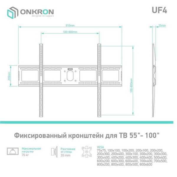 Кронштейн ONKRON/ 40-80" макс. 800*600, наклон 0?, поворот 0?, от стены 35мм, вес до 75кг, черный