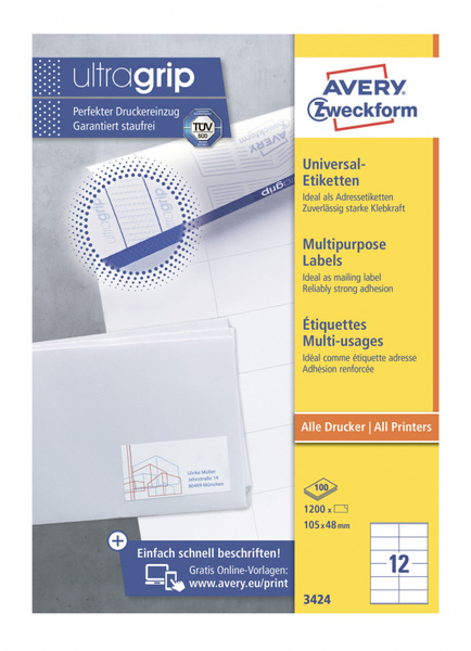 Этикетки Avery Zweckform 3424 A4 105x48мм 12шт на листе/70г/м2/100л./белый матовое самоклей. универсальная купить в интернет-магазине TPShop.Ru. Наличный и безналичный расчет, розничные и оптовые продажи. Самовывоз, доставка по Москве и МО, отправка во все регионы России.