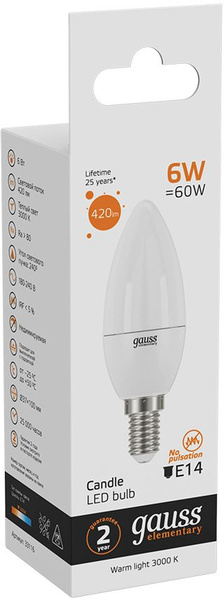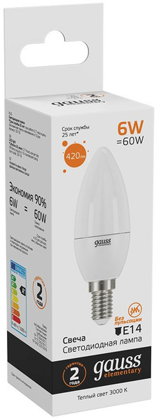 GAUSS 33116 Светодиодная лампа LED Elementary Свеча 6W E14 420lm 3000K