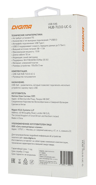 Digma HUB-7U3.0-UC-G купить в интернет-магазине TPShop.Ru. Наличный и безналичный расчет, розничные и оптовые продажи. Самовывоз, доставка по Москве и МО, отправка во все регионы России.