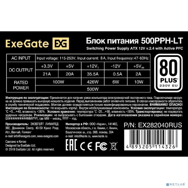 Блок питания Exegate EX282040RUS Блок питания 500W Exegate 500PPH-LT, 80+,RTL ATX, black, APFC, 12cm, 24p, (4+4)p, 5*SATA, 3*IDE купить в интернет-магазине TPShop.Ru. Наличный и безналичный расчет, розничные и оптовые продажи. Самовывоз, доставка по Москве и МО, отправка во все регионы России.