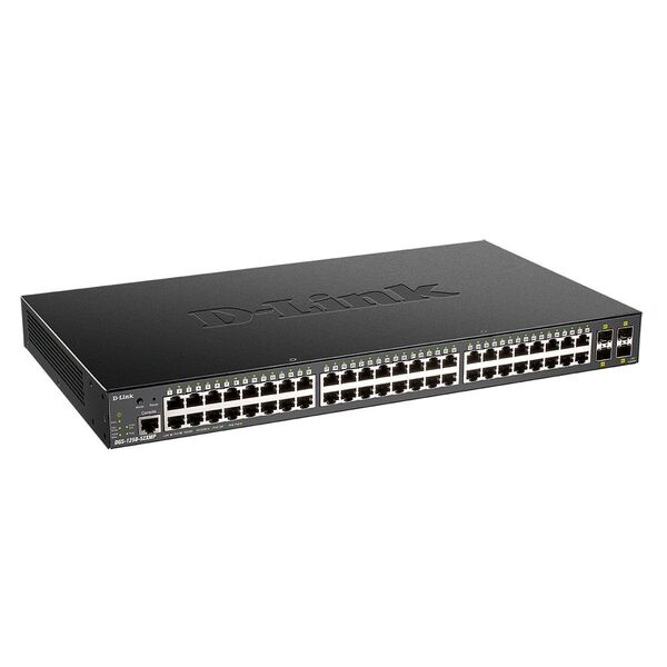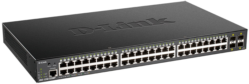 Управляемый коммутатор для рабочих групп D-Link DGS-1250-52XMP/A1A, L2 Smart Switch with 48 10/100/1000Base-T ports and 4 10GBase-X SFP+ ports (48 PoE ports 802.3af/802.3at (30 W), PoE Budget 370W).16K Mac address, 802.3x Flow Control, 4K