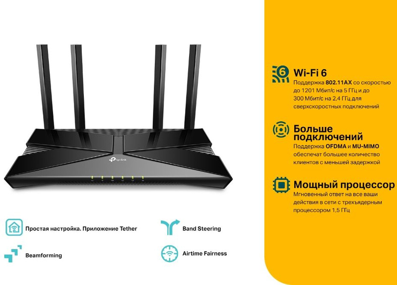 Роутер TP-Link Archer AX10, AX1500 Wi Fi 6, до 300 Мбит / с на 2, 4 ГГц + до 1201 Мбит / с на 5 ГГц, 4 антенны, 1 гигабитный порт WAN + 4 гигабитных порта LAN