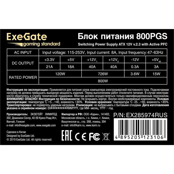 Блок питания Exegate EX285974RUS Блок питания 800W ExeGate Gaming Standard 800PGS RTL, ATX, black, APFC, 14cm, 24p+2*(4+4)p, PCI-E, 5SATA, 4IDE купить в интернет-магазине TPShop.Ru. Наличный и безналичный расчет, розничные и оптовые продажи. Самовывоз, доставка по Москве и МО, отправка во все регионы России.