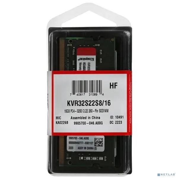 Оперативная память Kingston DDR4 SODIMM 16GB KVR32S22S8/16 PC4-25600, 3200MHz, CL22