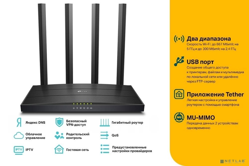 Роутер двухдиапазонный Wi Fi TP-Link Archer C6U AC1200, до 300 Мбит / с на 2, 4 ГГц + до 867 Мбит / с на 5 ГГц, 4 антенны, 1 гигабитный порт WAN + 4 гигабитных порта LAN, порт USB 2.0