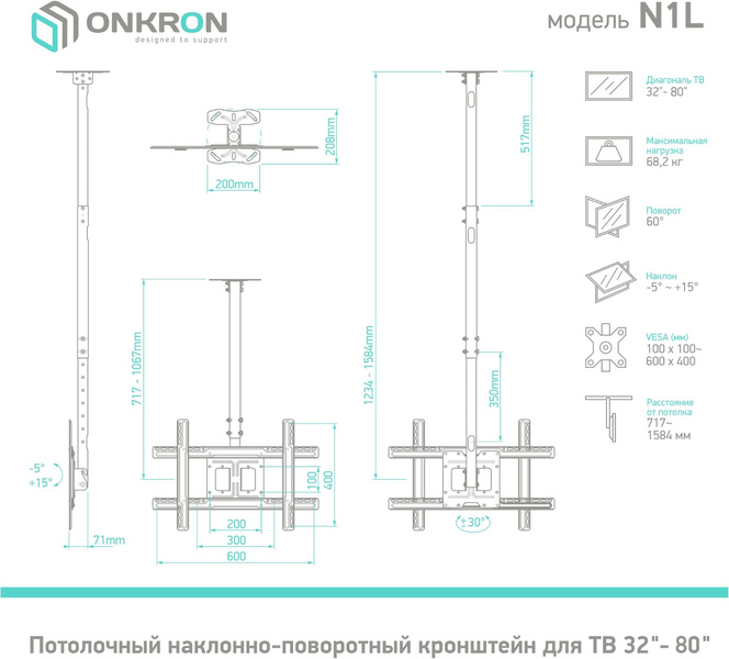 - Потолочный кронштейн для ТВ ONKRON N1L предназначен для панелей с диагональю экрана от 32 до 80 дюймов. Максимальный выдерживаемый вес составляет 68,2 кг, что делает кронштейн подходящим для средних и больших digital-панелей.