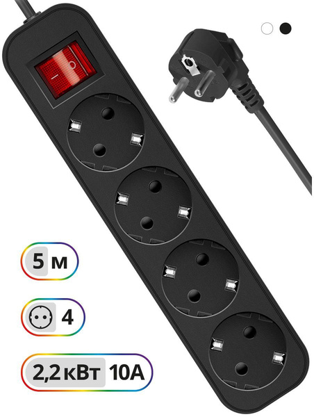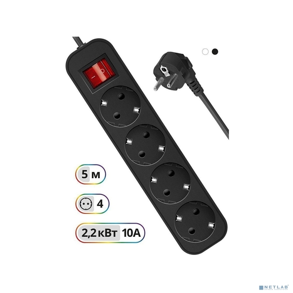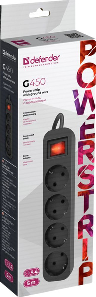 Defender Удлинитель с заземлением G450 Выключатель, 5.0 м, 4 розетки (99339)