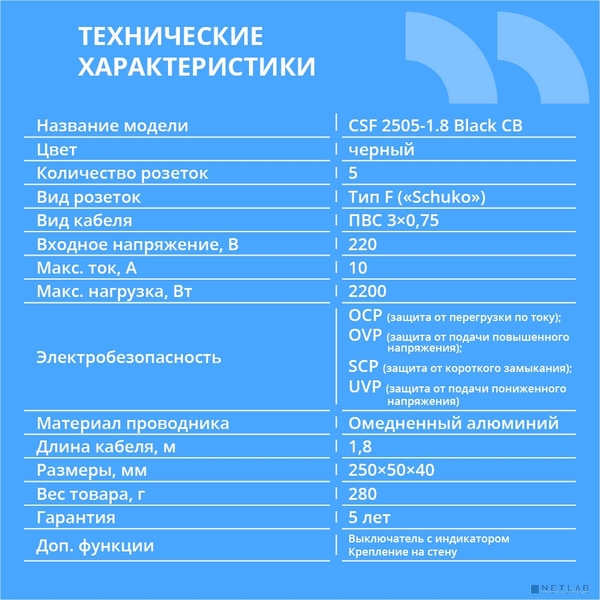 CBR CSF 2505-1.8 Black CB Сетевой фильтр, 5 евророзеток, длина кабеля 1, 8 метра, цвет чёрный (коробка)