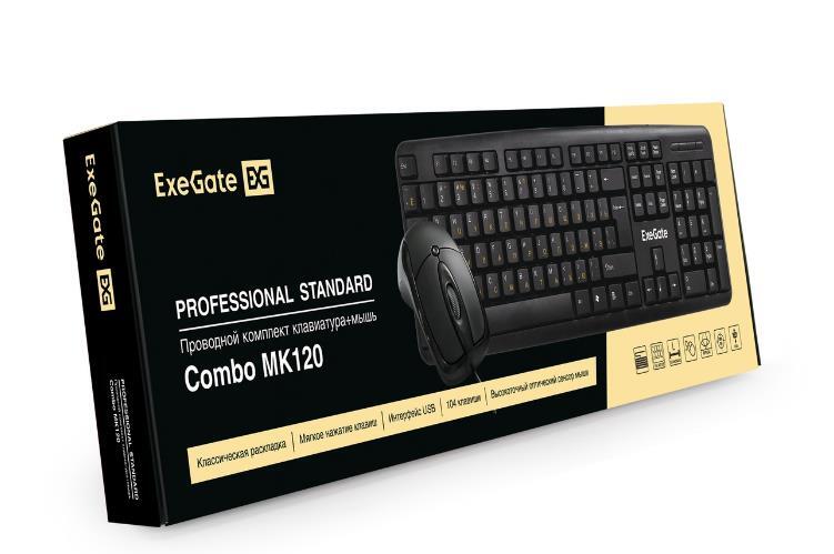 Клавиатура Exegate EX286204RUS Комплект ExeGate Professional Standard Combo MK120 (клавиатура влагозащищенная 104кл.+ мышь оптическая 1000dpi,3 кнопки и колесо прокрутки; USB,длина кабелей 1,5м,черный,ColorBox)