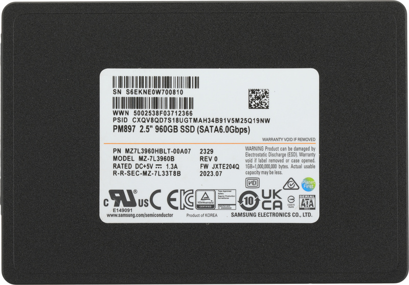 Samsung Enterprise SSD, 2.5", PM897, 960GB, SATA, 6Gb / s, R560 / W530Mb / s, IOPS (R4K) 97K / 60K, V6 TLC, MTBF 2M, 3 DWPD, OEM, 5 years, (analog MZ7KH960HAJR-00005)