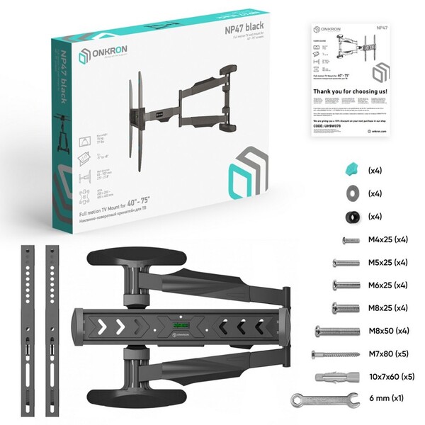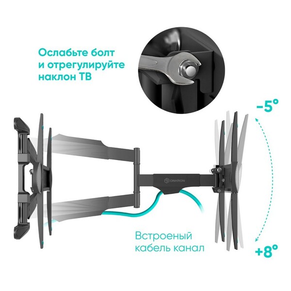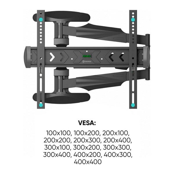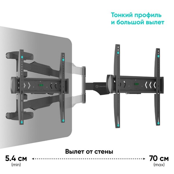 Кронштейн ONKRON/ 40-75" макс 400*400 наклон -5°/+8° поворот 180? Макс нагрузка 35кг от стены: 65-707мм, черный