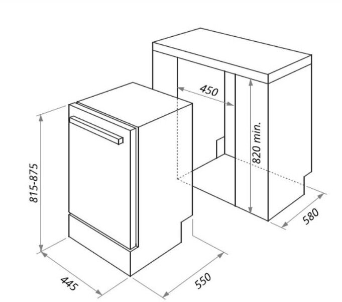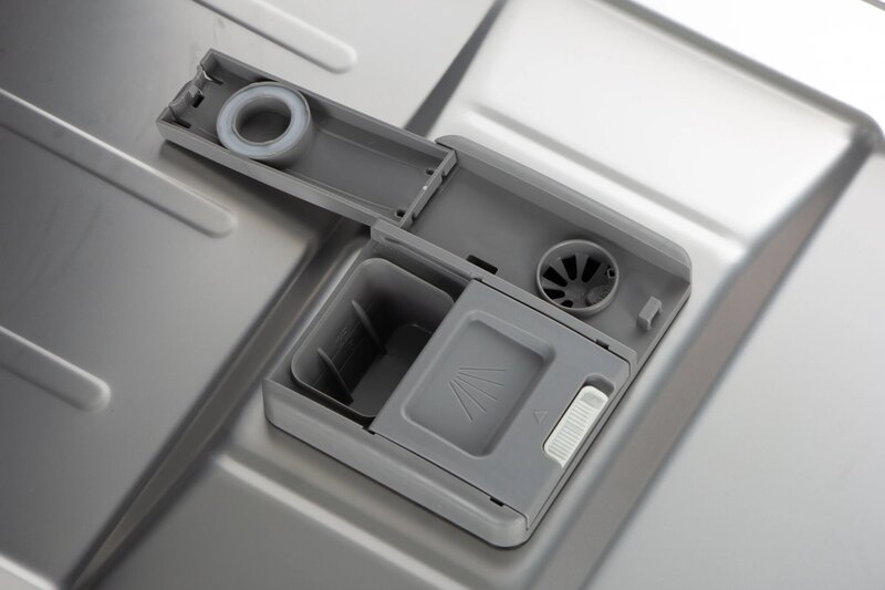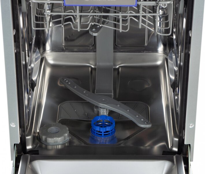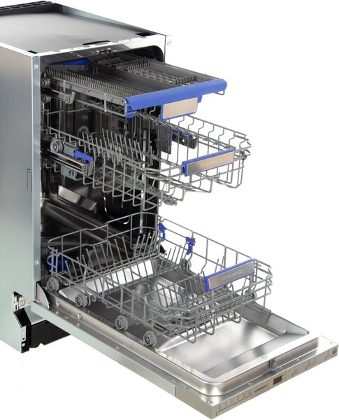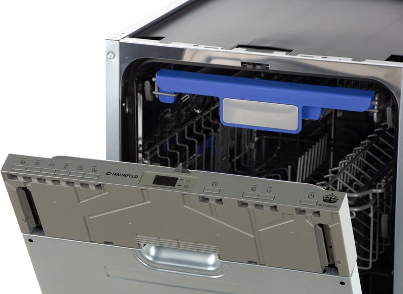 - корзина для столовых приборов, освещение, полки для кружек, разбрызгиватель над верхней корзиной, складные держатели тарелок
