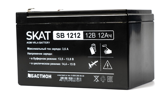 Аккумуляторная батарея SKAT SB 1212, 12V, 12Ah, maximum charge current 3.6 A. Terminal type - F1 knife. Case size - 99x151x100. Weight - 3.2 kg. Service life - 6 years. Warranty - 18 months.