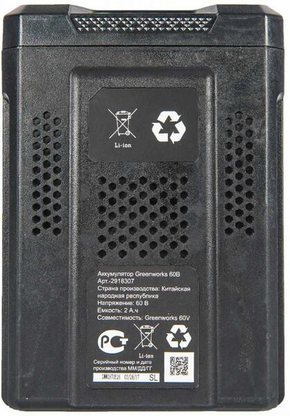 Greenworks Аккумулятор G60B2, {60V, 2 А.ч} [2918307] купить в интернет-магазине TPShop.Ru. Наличный и безналичный расчет, розничные и оптовые продажи. Самовывоз, доставка по Москве и МО, отправка во все регионы России.