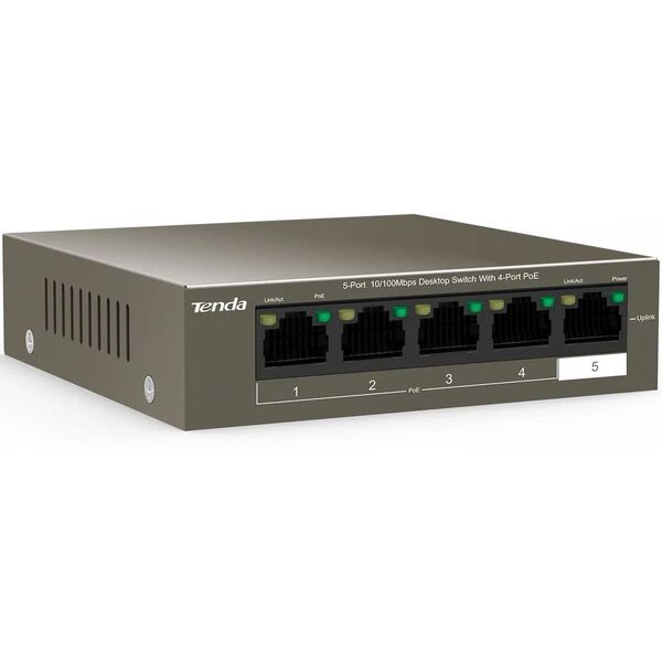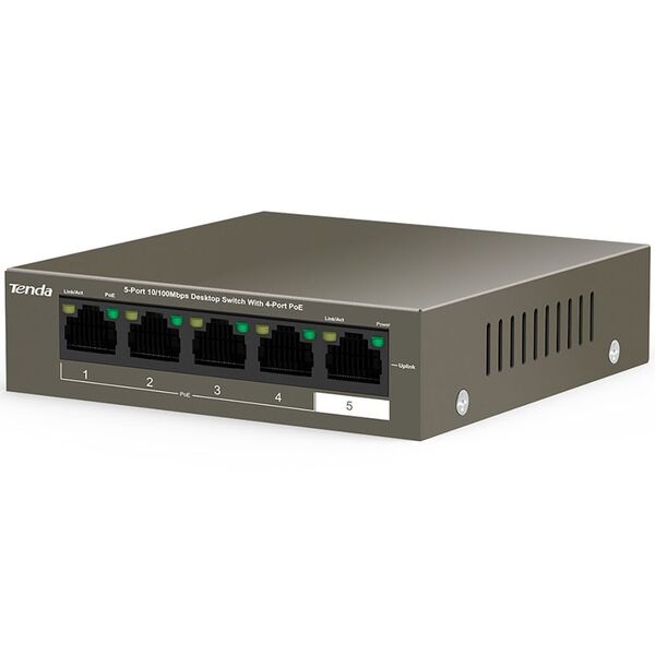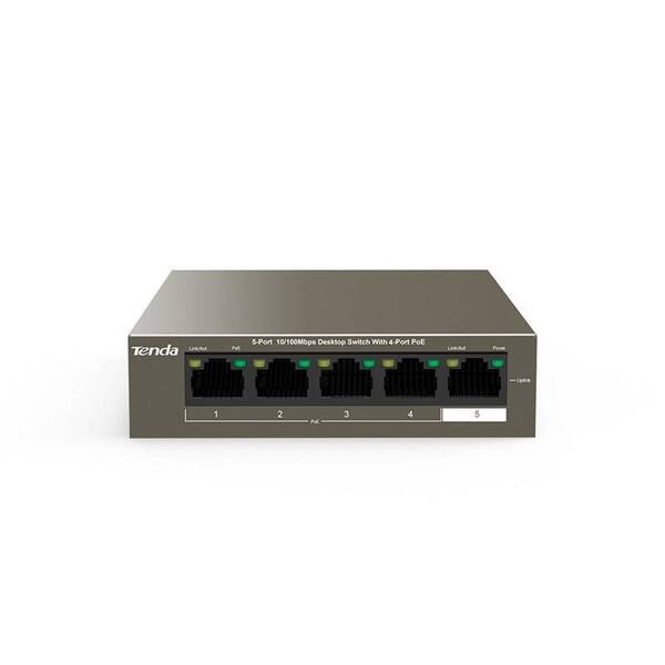 Tenda TEF1105P-4-38W PoE, который имеет 5 портов 10 / 100 Мбит / с Base-TX RJ45. Передача на расстояние до 250 метров