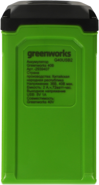 Greenworks Аккумулятор с USB разъемом GreenWorks G40USB2, 40V, 2 А.ч [2939407] купить в интернет-магазине TPShop.Ru. Наличный и безналичный расчет, розничные и оптовые продажи. Самовывоз, доставка по Москве и МО, отправка во все регионы России.