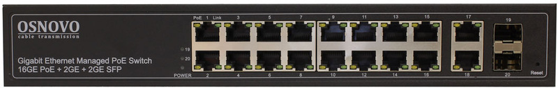 Управляемый коммутатор для рабочих групп OSNOVO Управляемый L2 PoE коммутатор Gigabit Ethernet на 16 RJ45 PoE + 2 x RJ45 + 2 GE SFP портов, до 30W на порт, суммарно до 300W