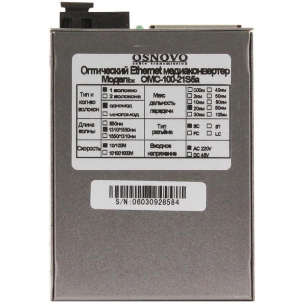 Медиаконвертор OSNOVO Медиаконвертер FE, 2*10/100Base-T, 1 оптический порт (SC, tx1310нм/rx1550нм) 100Base-FX, до 20 км