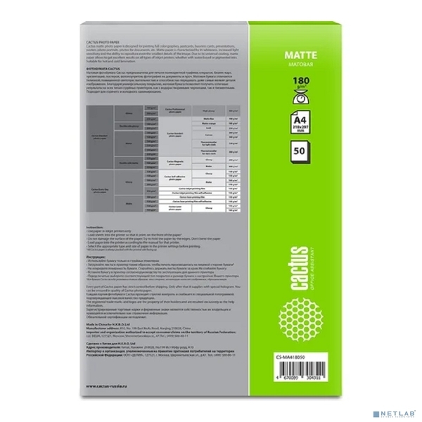 Фотобумага Cactus CS-MA418050 A4/180г/м2/50л./белый матовое для струйной печати купить в интернет-магазине TPShop.Ru. Наличный и безналичный расчет, розничные и оптовые продажи. Самовывоз, доставка по Москве и МО, отправка во все регионы России.