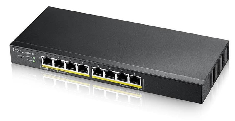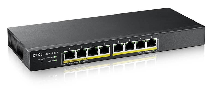 Гибридный Smart L2 коммутатор PoE+ Zyxel NebulaFlex GS1915-8EP, 8xGE PoE+, бесшумный (без вентилятора), бюджет PoE 60 Вт, автономное/облачное управление