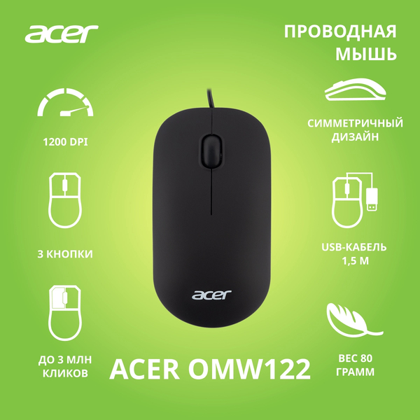 Мышь Acer OMW122 черный оптическая (1200dpi) USB (3but) купить в интернет-магазине TPShop.Ru. Наличный и безналичный расчет, розничные и оптовые продажи. Самовывоз, доставка по Москве и МО, отправка во все регионы России.