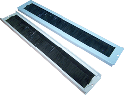 - Отверстия для щеточного ввода находятся в верхней и нижней панелях шкафа. Использование щеточных вводов позволяет защитить оборудование в шкафу от проникновения пыли и грязи, снижает риск повреждения кабеля о края вводного лючка, обеспечивает частичную фиксацию кабеля, вводимого в шкаф. Материал - металлическая рама и щетина из ПВХ