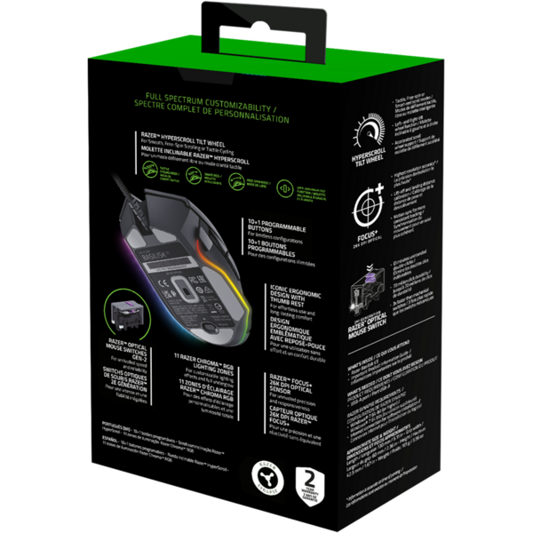 - Оптический сенсор Razer Focus+ с разрешением 26 000 DPI. Подключение: проводное по кабелю Razer Speedflex Cable. Наклонное колесо прокрутки: 4 направления прокрутки Razer HyperScroll Tilt Wheel, электронно-управляемые режимы прокрутки и режим свободного вращения.
