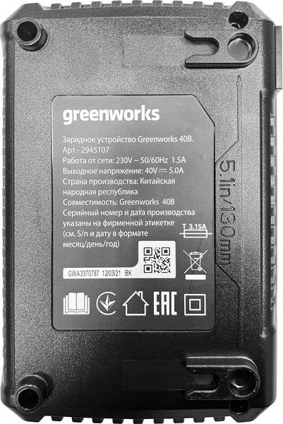 - Быстрое зарядное устройство G40UC55 Greenworks 2945107 заряжает в 2 раза быстрее, чем обычная зарядка! Подходит для 2 Ач и 4 Ач аккумуляторов серии Greenworks 40V. Максимальный ток заряда 5 А.
