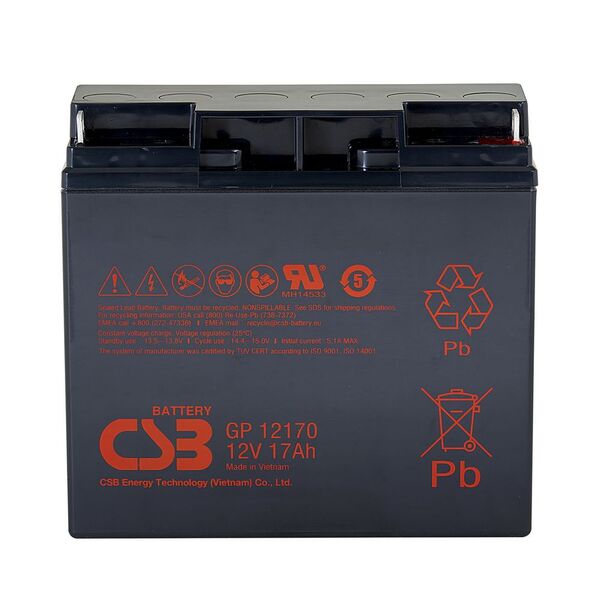 Аккумуляторная батарея Battery CSB series GP, GP12170 B3, voltage 12V, capacity 17Ah (discharge 20 hours), max. discharge current (5 sec.) 230A, short circuit current 532A, max. charge current 5.1A, lead-acid type AGM, terminals B3, for nut and bolt M6, LxWxH 181x76.2x167mm., weight 5.5kg., service life 5 years.