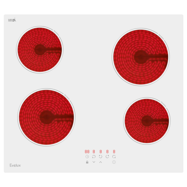 стеклокерамика EVELUX HEV 640 W, Hi Light, 60 см, 4 конфорки, сенсорное управление, 9 уровней мощности, таймер 1-99 мин, блокировка управления, защитное отключение, 6000 Вт, белое стекло Eurokera (Франция), 590х520х50 мм.