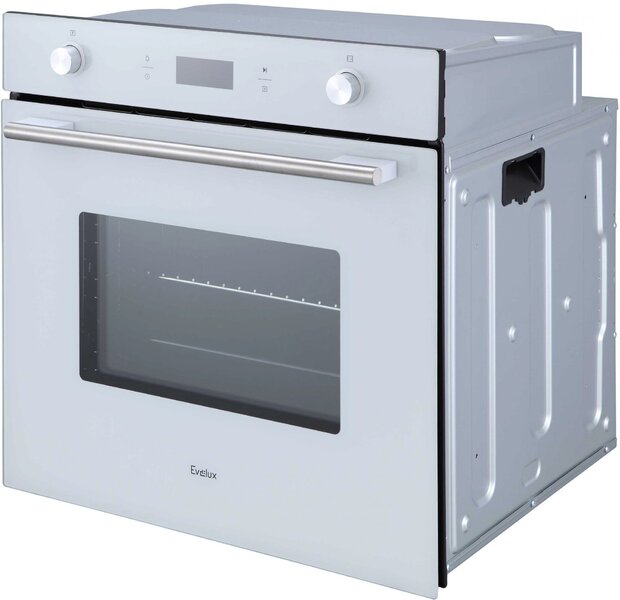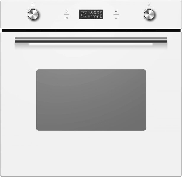 Духовой шкаф Духовой шкаф встраиваемый полноразмерный, 60 см, 9 режимов, объем духовки 70л, утапливаемые переключатели, большой дисплей Snow White, хромированные боковые решетки, телескопические направляющие 1 уровнь, панель управления - белое стекло, универсальный противень, решетка-гриль, тройное стекло дверцы, легко-съемное большое внутреннее стекло Full Glass, защитное отключение, охлаждающий вентилятор, электронный таймер 9 часов, 595х575х595 мм.