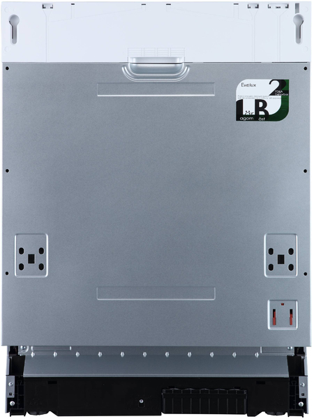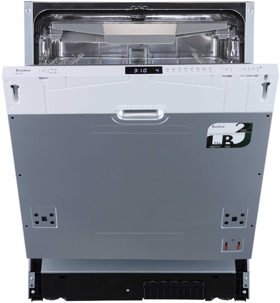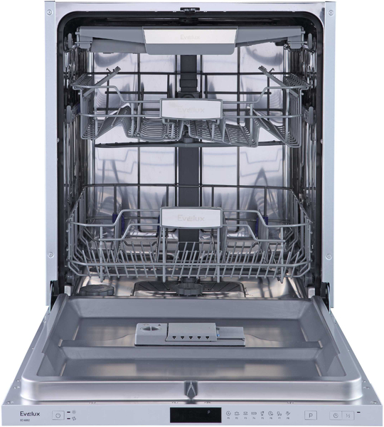 EVELUX BD 6002 Встраиваемая посудомоечная машина полноразмерная, 60 см, выдвижной лоток для столовых приборов, 8 программ, 14 комплектов, 60 см, дисплей, таймер 1-24, А++АА, 47 дб уровень шума, регулировка корзины по высоте Easy Lift, половинная загрузка, луч на полу, 11 л потребление воды, 598х550х815 мм.