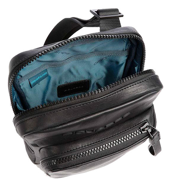 - Вертикальная сумка на плечевом ремне Piquadro выполнена из натуральной телячьей кожи с легким глянцевым блеском и отделана голубым кантом. Одно основное отделение, отделение для mini Ipad, карман на молнии, съемное крепление для ключей.