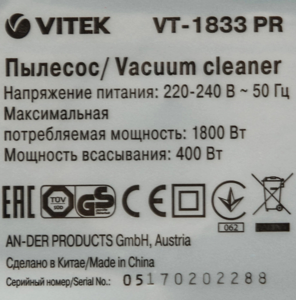 - Мощность 1800 Вт. Мощность всасывания 400Вт. Без мешка для сбора пыли. Аквафильтр. Легко разбирается и моется. 5-ступенчатая система фильтрации с аквафильтром, НЕРА-фильтром. Регулятор мощности на корпусе. Пылесборник 3,5 литра. Длина шнура 5 метров. 3 насадки. Турбощётка. Щётка для пыли.
