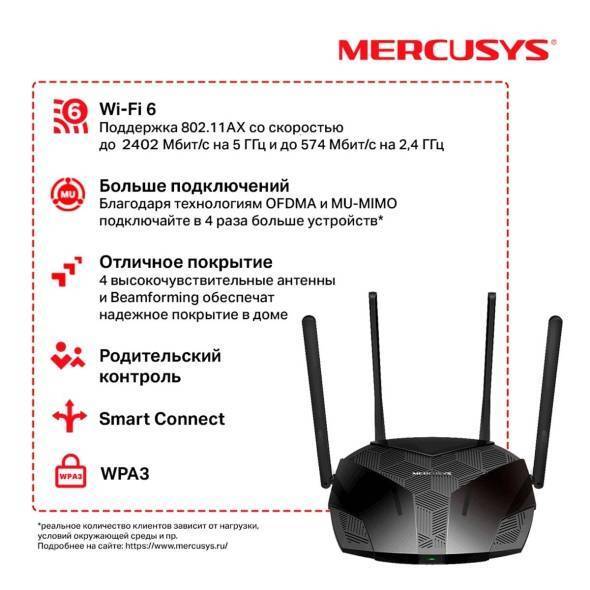 MERCUSYS AX3000 Двухдиапазонный Wi-Fi 6 роутер, до 574 Мбит / с на 2, 4 ГГц + до 2402 Мбит / с на 5 ГГц, 4 фиксированные внешние антенны, 3 гигабитных порта LAN, 1 гигабитный порт WAN