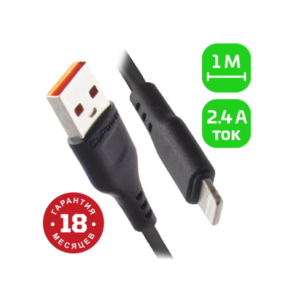 Кабель GoPower GP01L USB (m)-Lightning (m) 1.0м 2.4A ПВХ черный (1/800)