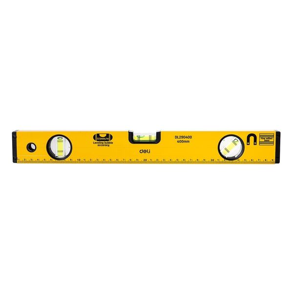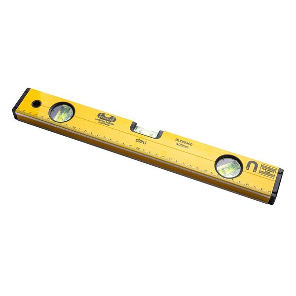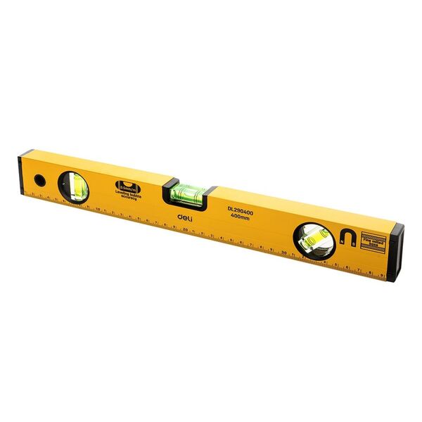 Строительный уровень Deli DL290400 400мм Алюминиевый сплав. Мягкая резина на обоих концах. Магнит для удобства эксплуатации. Измерение под углом 45°.