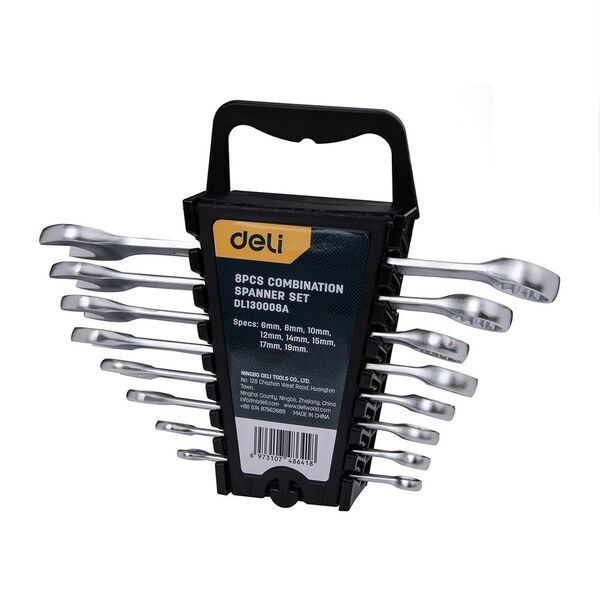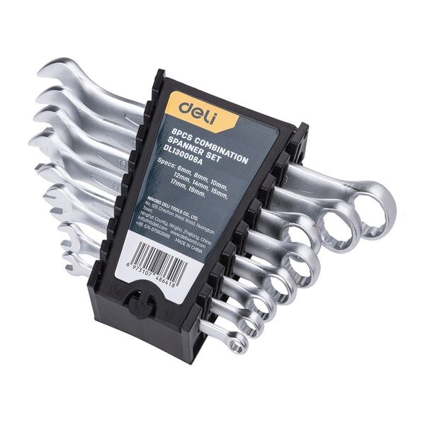 Набор комбинированных гаечных ключей 8 шт Deli DL130008A Спецификация: 6 мм, 8 мм, 10 мм, 12 мм, 14 мм, 15 мм, 17 мм, 19 мм. Матовая хромированная поверхность. Пластиковая упаковка.