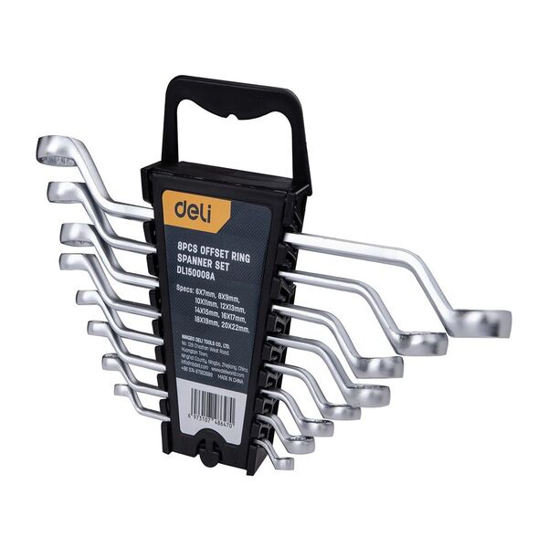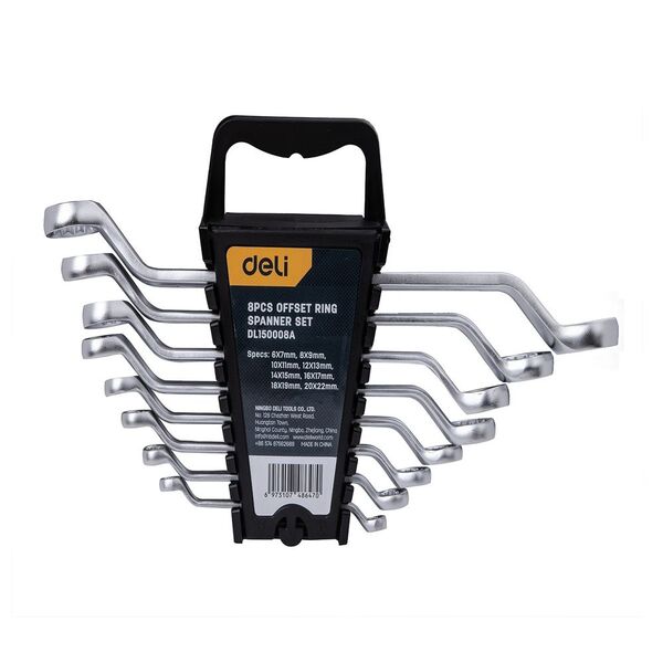 Набор накидных изогнутых гаечных ключей 8 шт Deli DL150008A Спецификация: 6x7мм, 8x9мм, 10x11мм, 12x13мм, 14x15мм, 16x17мм, 18x19мм, 20x22мм. Матовая хромированная поверхность. Пластиковая упаковка.