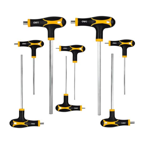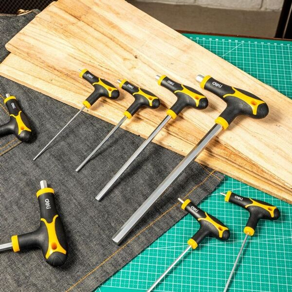 Набор шестигранных ключей Deli DL233108 8 шт. Материал: CR-V. Спецификация: 2x75 мм/2,5x75 мм/3x100 мм/4x100 мм/5x150 мм/6x150 мм/8x200 мм/10x200 мм. Удобная рукоять.