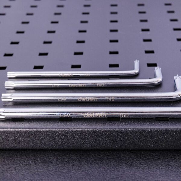Набор шестигранных ключей ";TORX"; Deli DL3091 9 шт. Размер: 1/16”-3/8”. Хромированный. Технические характеристики: Т10,Т15,Т20,Т25,Т27,Т30,Т40,Т45,Т50