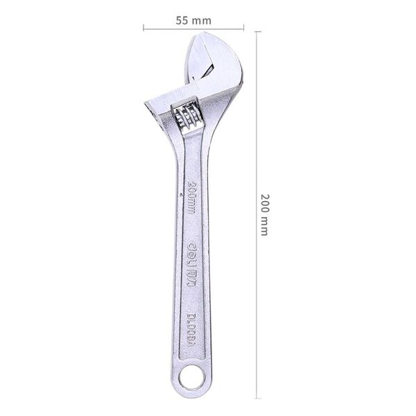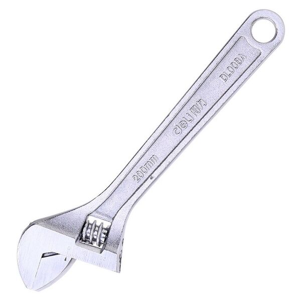 Разводной ключ Deli DL008A 8"; Длина: 200 мм. Регулируемый размер зажима: 0-28 мм. Кованая специальная инструментальная сталь. Хромированная отделка.