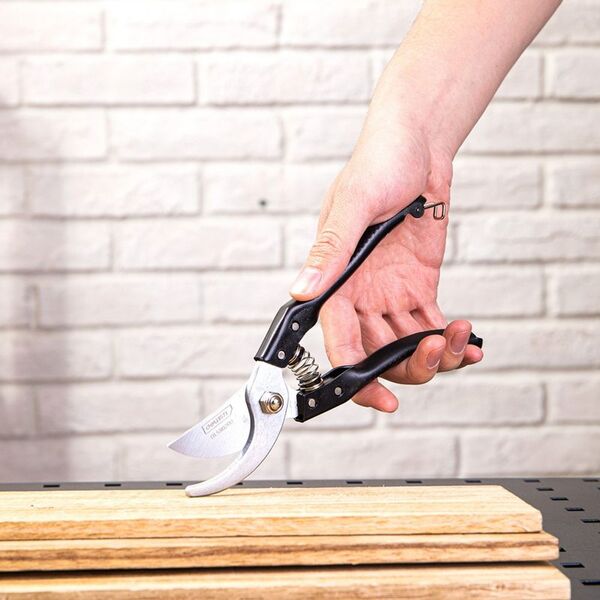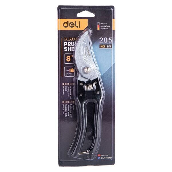 Секатор Deli DL580200 Размер 205 мм. Макс диаметр резки 14 мм. Сталь 65 MN. Ручка из ПВХ.