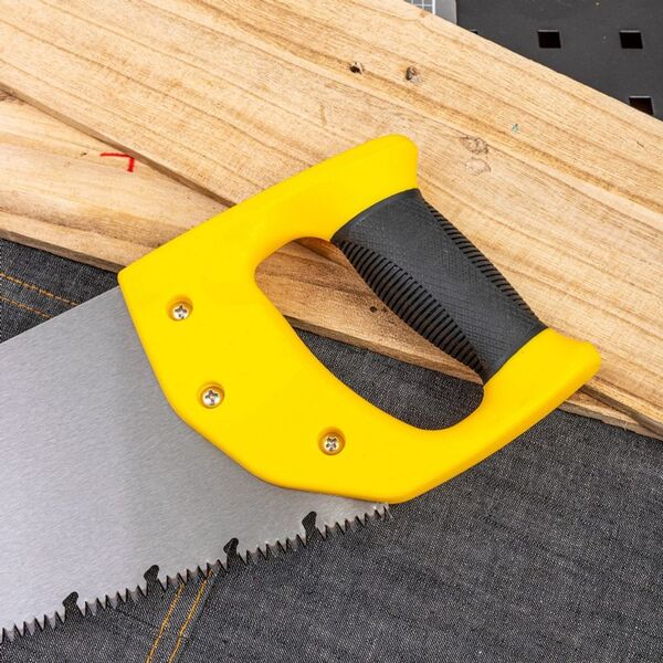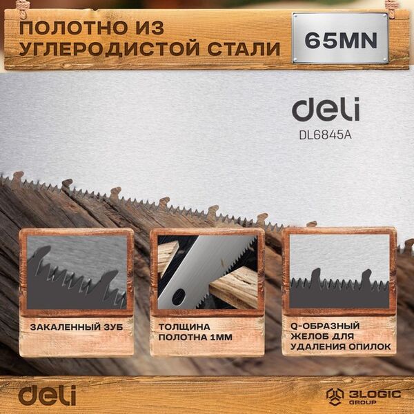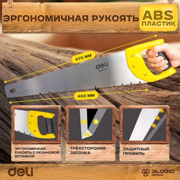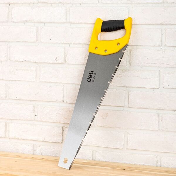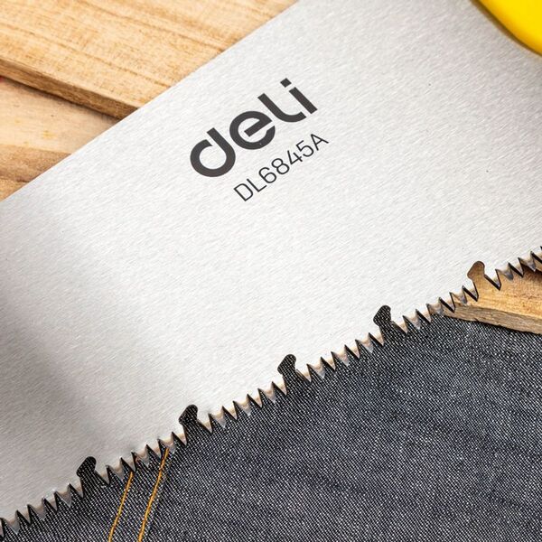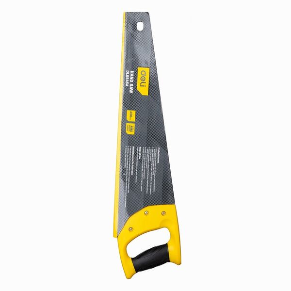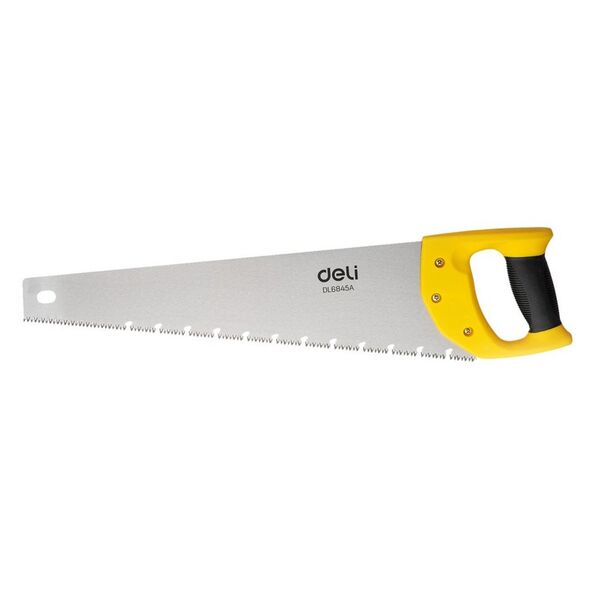 Ножовка по дереву Deli DL6845A 450мм Материал: 65Mn. Термообработанная поверхность. Шлифовка зубов с 3-х сторон. Литая ручка из двухкомпонентного противоударного пластика.