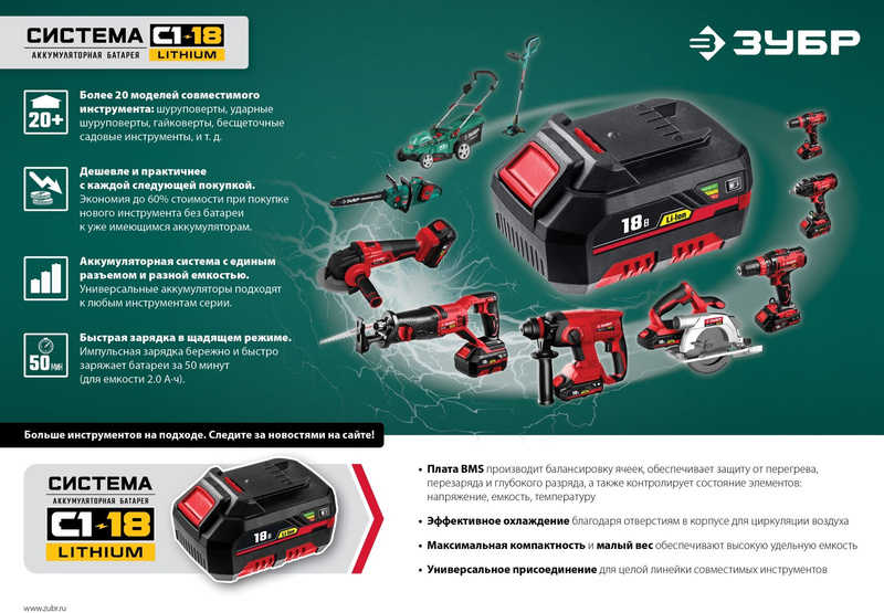 - Единая аккумуляторная система С1-18В для множества инструментов. Большой бак для смеси объемом 15 л обеспечивает длительную работу без дозаправки. Небольшой вес - для работы без усталости. Широкая горловина бака - легкое заполнение жидкостью. 3 сменные насадки.