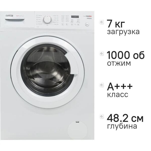 Стиральная машина Atlant 70С105-00 Максимальная загрузка 7 кг, Отжим - до 1000 оборотов в минуту, Класс энергоэффективности А+++ , Класс стирки - А, 11 основных программ стирки, Звуковая сигнализация, сигментный дисплей, светодиодная индикация,блокировка дверцы от закрывания