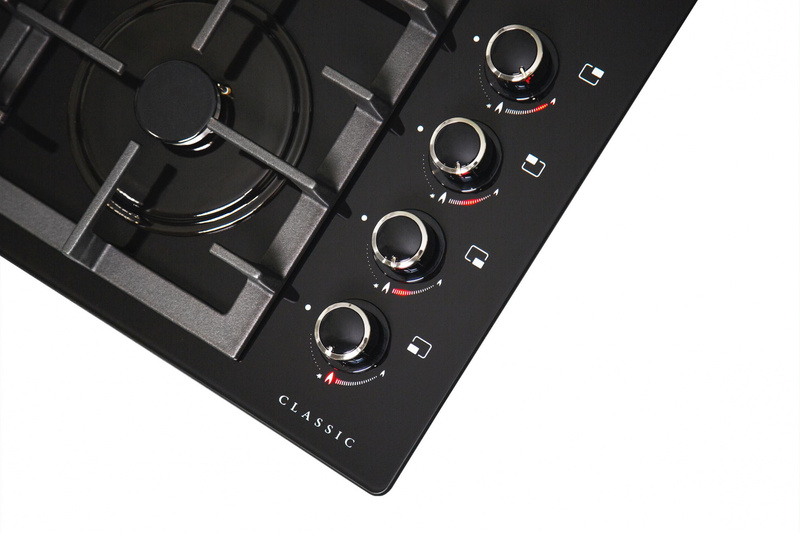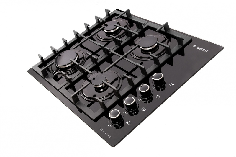 Газовая варочная панель EVELUX, Hi-Tech, 60 см, 4 конфорки, чугунные решетки, газ-контроль, электроподжиг, механическое управление, поверхность из закаленного стекла, цвет черный