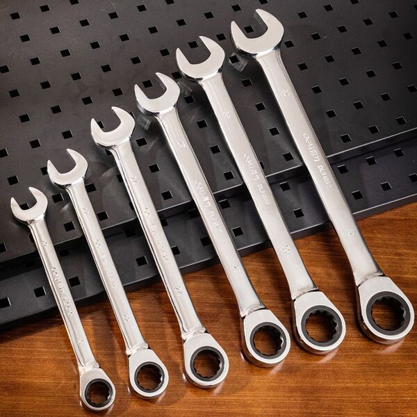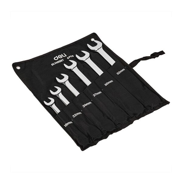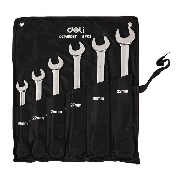 Набор комбинированных ключей с трещоткой 6 шт Deli DL140106T Спецификация: 19,22,24,27,30,32мм. Сталь 40 Cr. Трещотка 50BV30 72Т. Чехол из ткани Oxford